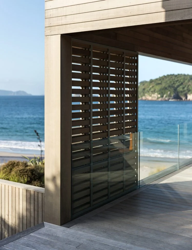 The client requested a durable shutter system that would survive being right on the oceanfront. AES combined a tried and tested roller system, with a precision CNC machined frame to hold cedar slats. The champagne frost anodized perimeter frame was designed with seamless joins, that won’t corrode over time.